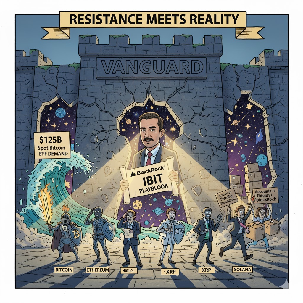 Vanguard finally opens crypto access after years of resistance, driven by customer demand, ETF growth, and leadership change—marking a full institutional shift toward mainstream crypto adoption.