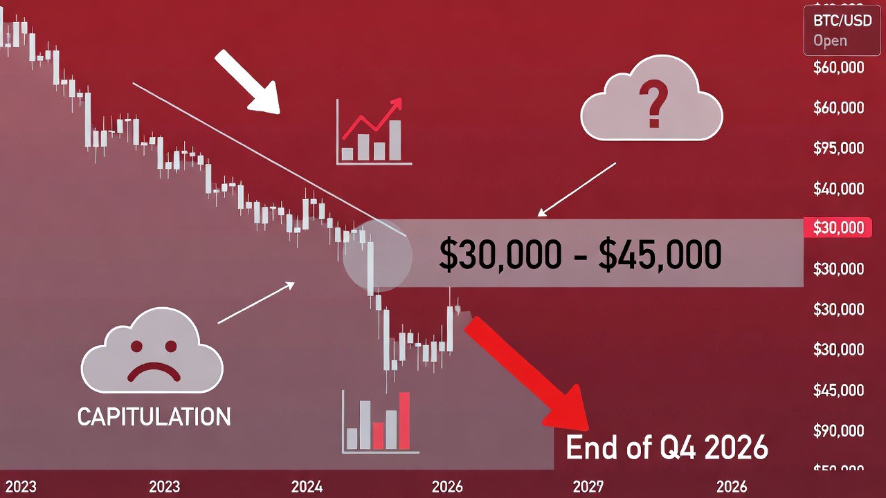 Analysts forecast Bitcoin dropping from ~$66K to $30K–$45K by Q4 2026, citing bearish on-chain signals, macro uncertainty, and potential capitulation zone.