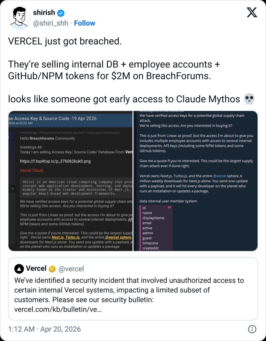Vercel’s confirmation came after multiple X users reported that a post on the hacking forum BreachForums by a user called “ShinyHunters” claimed to be offering Vercel’s data in exchange for $2 million.