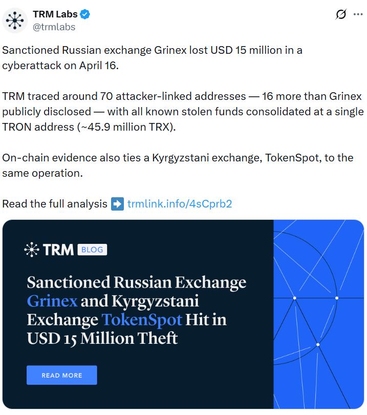 Grinex may not have been the only exchange targeted. Blockchain intelligence company TRM Labs said on Thursday that two wallets from TokenSpot, a Kyrgyzstan-based exchange with on-chain links to Grinex, sent around $5,000 to the same consolidation address used by the Grinex attacker.